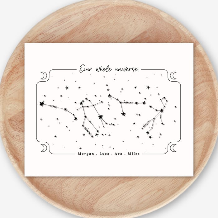 A dreamy, personalized zodiac-style print featuring your family names — a sweet way to celebrate your crew with something that feels modern and magical.