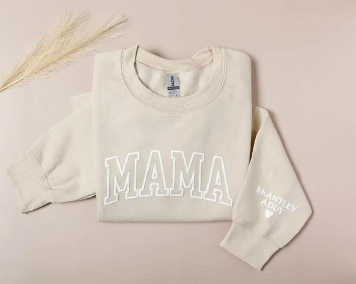 A cozy sweatshirt personalized with children’s names on the sleeve — a heartfelt favorite for moms.