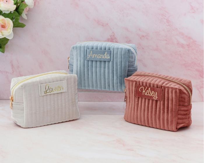 A soft velvet cosmetic bag personalized with a name or monogram, making travel organization feel just a little more elevated.